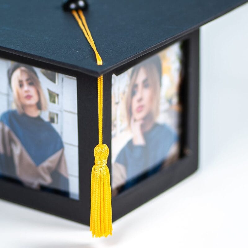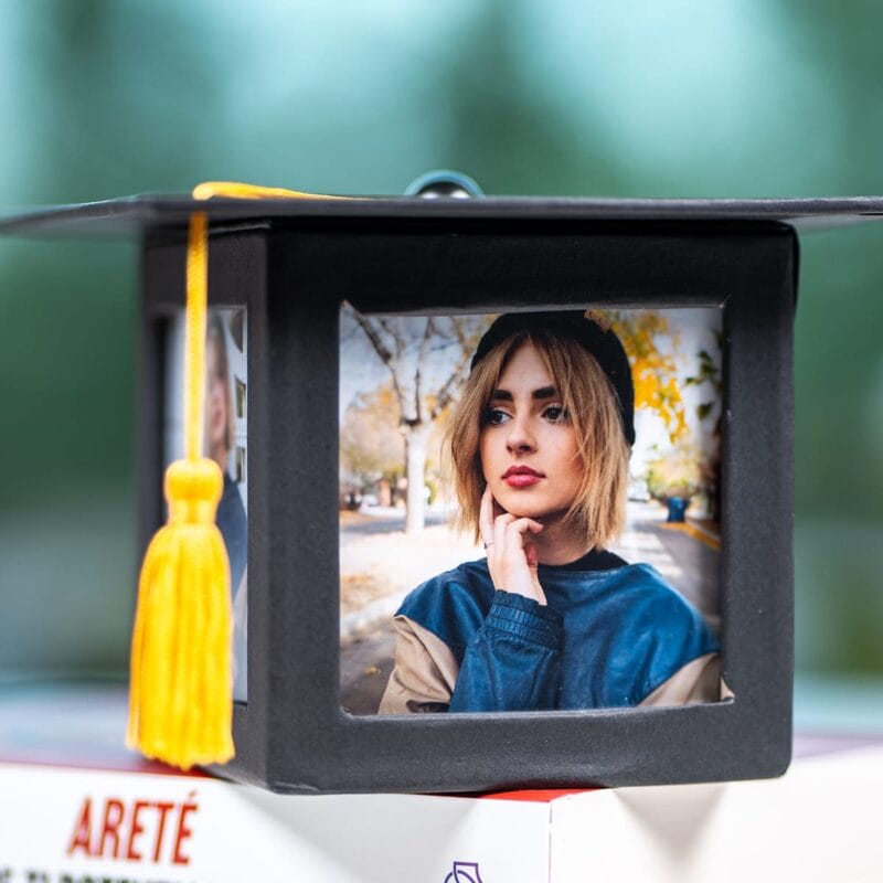Așteaptă în față să prindă viață cu două fotografii alese de tine – poate una de la începutul anilor de studiu, plină de emoții și visuri, și una din ziua triumfului, radiind de fericire? E o fereastră către cele mai frumoase amintiri! Ciucurele galben, vibrant și plin de optimism, simbolizează strălucirea reușitei.