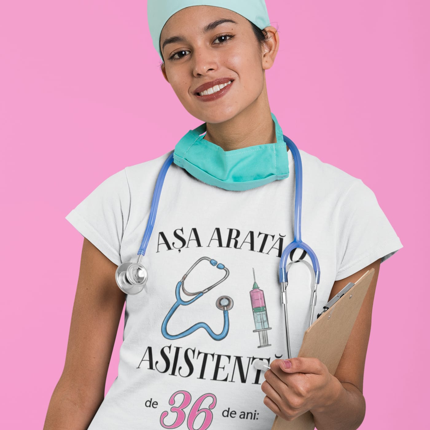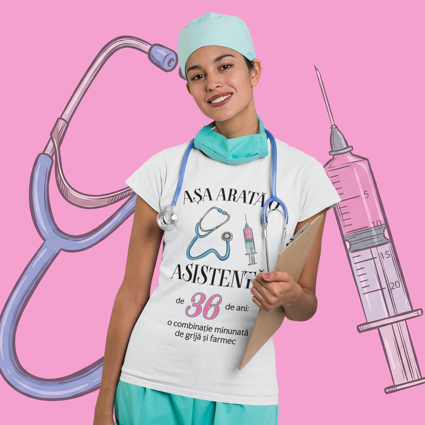 Imaginează-ți zâmbetul ei când va descoperi acest tricou moale și confortabil, personalizat special pentru ea! Designul include o ilustrație stilizată și prietenoasă cu un stetoscop și o seringă, elemente emblematice ale profesiei sale nobile.