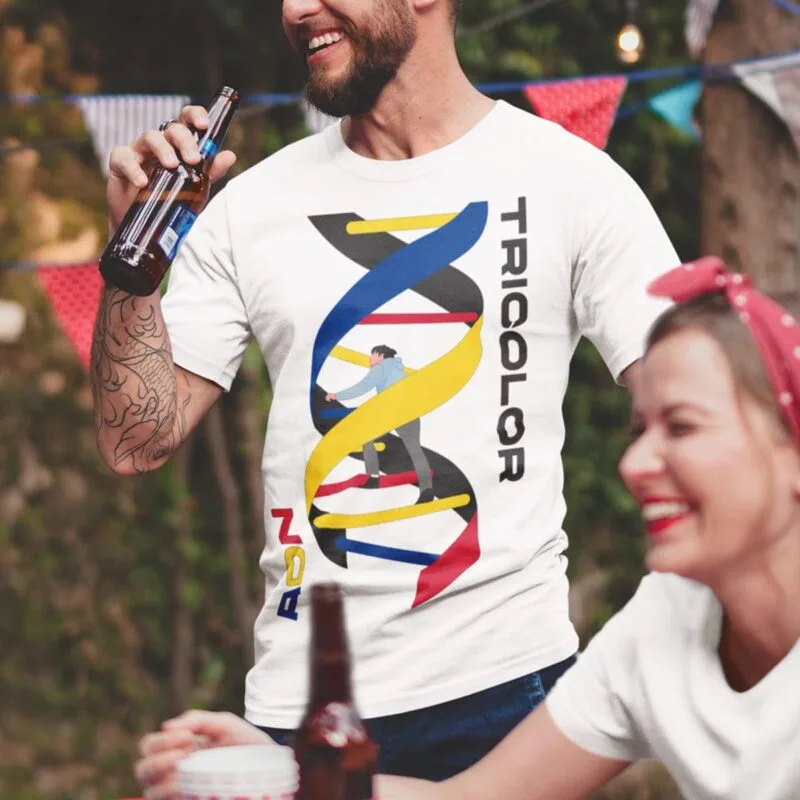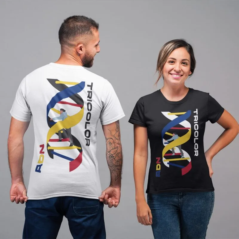 Simți și tu acea chemare nerostită, acea legătură adâncă și vibrantă cu pământul acesta binecuvântat, România? Acest tricou este o declarație purtată cu mândrie, aproape de inimă. Privește-i cu atenție designul profund și original: un om, poate chiar tu, pășind cu speranță și hotărâre pe scările tricolore, o călătorie simbolică înfășurată chiar în esența ființei tale – secvența ADN-ului tău.